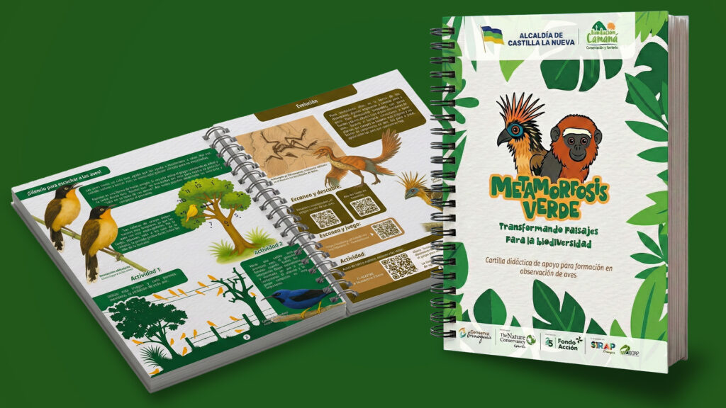 Se diseñó una cartilla didáctica para el municipio de Castilla La Nueva, orientada al aprendizaje sobre la avifauna, que integra contenidos temáticos y pedagógicos, y se complementa con un pendón, un juego de cartas, un juego de lotería y hojas de stickers; esta iniciativa hace parte del Proyecto Metamorfosis Verde, financiado por Fondo Acción y The Nature Conservancy (TNC). (2025)